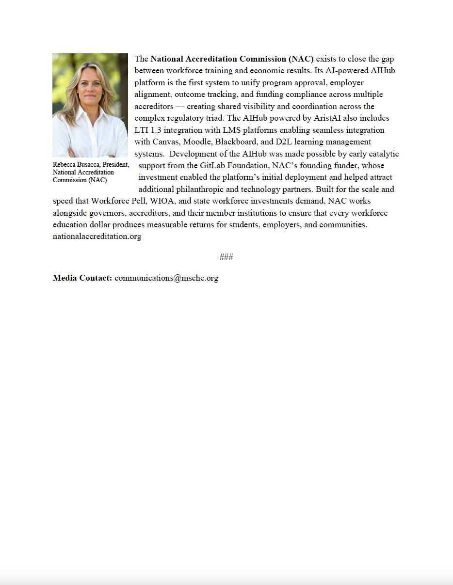At AristAI, we are honored to stand alongside the visionary leadership team at the The National Accreditation Commission (NAC). Specifically, we want to recognize President and Founder, Rebecca Busacca, COO Robert Busacca and her team for their tireless advocacy and for building the national infrastructure that makes workforce education as reliable and scalable as the internet.