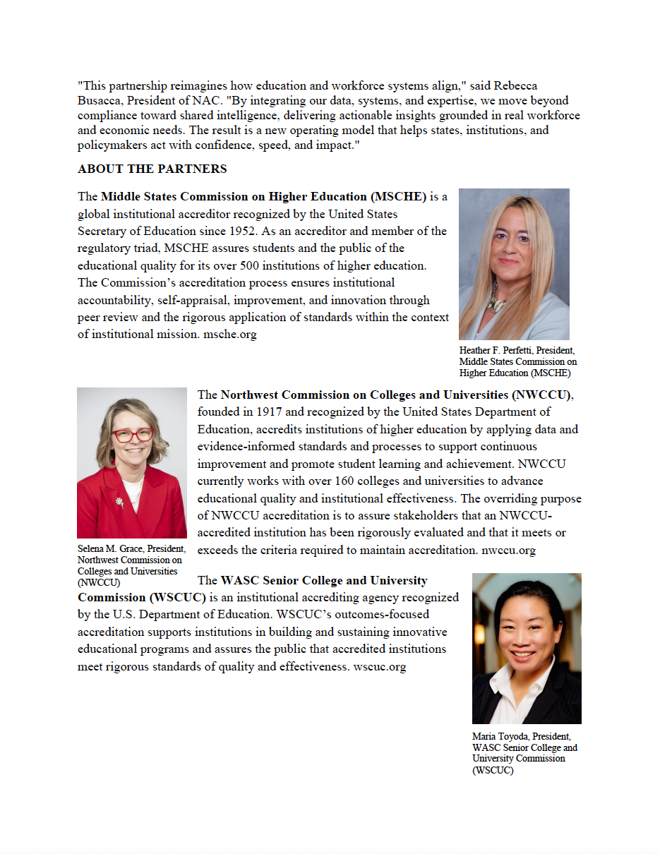 Middle States Commission on Higher Education, Northwest Commission on Colleges and Universities and WASC Senior College and University Commission are partnering with The National Accreditation Commission to advance NAC’s Accreditation Information Hub (AIHub).